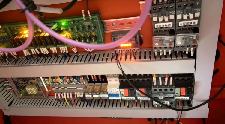 1、液壓站無(wú)反應(yīng),無(wú)壓力。我們檢查電箱,液壓站的控制器電路正常,繼電器正常工作,但是液壓站沒(méi)有反壓,電機(jī)不轉(zhuǎn),初步判斷是液壓站電機(jī)沒(méi)有進(jìn)電,這里我們首先去檢查了繼電器,工作正常,判斷有可能急停開(kāi)關(guān)的控制有問(wèn)題,急停后液壓站會(huì)不工作,我們拆看面板發(fā)現(xiàn)面板的急停開(kāi)關(guān)無(wú)異常,后檢查電箱發(fā)現(xiàn)確實(shí)是信號(hào)線(xiàn)路松脫,拔插過(guò)后問(wèn)題解決。